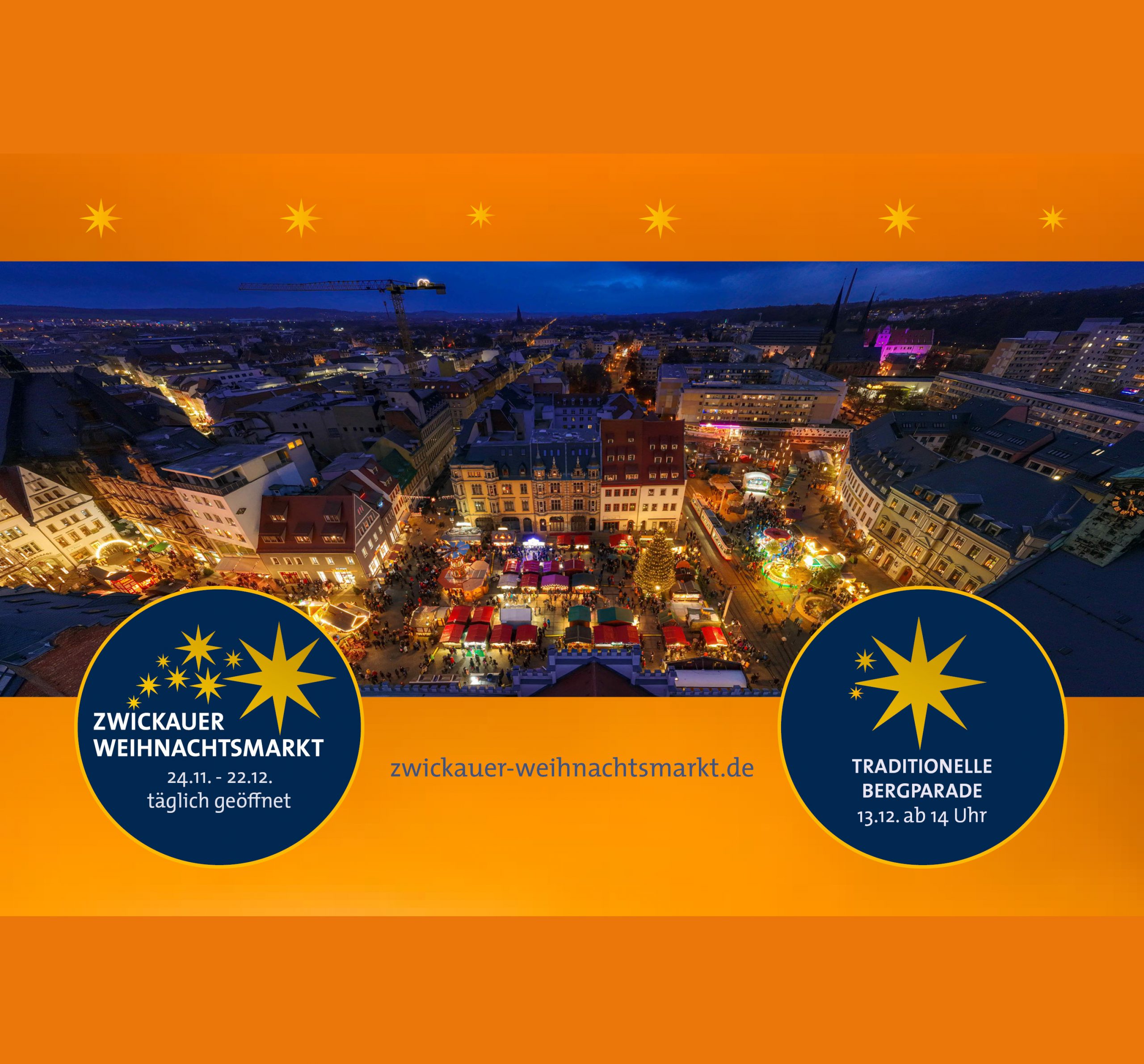 Auch in diesem Jahr locken Leckereien wie gebrannte Mandeln, warme Getränke wie Punsch und Glühwein und weihnachtliche Lichter auf den traditionellen Plauener Weihnachtsmarkt. Seit über 300 Jahren verwandelt sich die Plauener Innenstadt zur Adventszeit in ein stimmungsvolles Weihnachtsland. Mit Eisbahn, Bühnenprogramm und zahlreichen Buden ist wieder für jeden etwas dabei. Geöffnet hat der Plauener Weihnachtsmarkt vom 25. November bis zum 22. Dezember täglich von 11 bis 20 Uhr. Mit dem traditionellen Licht’l-Umzug vom Besucherbergwerk »Ewiges Leben« (ab 17.45 Uhr) zum Altmarkt, den Traditionsfiguren und vielen Plauener Familien mit Lampions startet der Markt am 25. November um 18 Uhr offiziell.