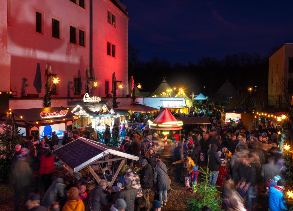 Wenn der Innenhof des Schlosses Osterstein im warmen Lichterglanz erstrahlt, duftet es nach Feuerholz, Glühwein und Räucherkerzen – dann ist wieder Zeit für die Zwickauer Schlossweihnacht! An allen vier Adventswochenenden lädt der stimmungsvolle Weihnachtsmarkt zum Verweilen, Entdecken und Genießen ein. Mehr als vierzig Händler und Schauhandwerker präsentieren handgefertigte Kostbarkeiten und regionale Erzeugnisse. Live-Musik mit Singer-Songwritern und Bands, das beheizte Märchenkino, Märchenerzählungen, Alpakas, Schneemann Olaf, Kinderrodelbahn und nostalgisches Karussell sorgen für leuchtende Augen bei Groß und Klein. In den gemütlichen Tipi-Zelten mit Schwedenfeuer und an den überdachten Feuerstellen lässt sich wunderbar verweilen.